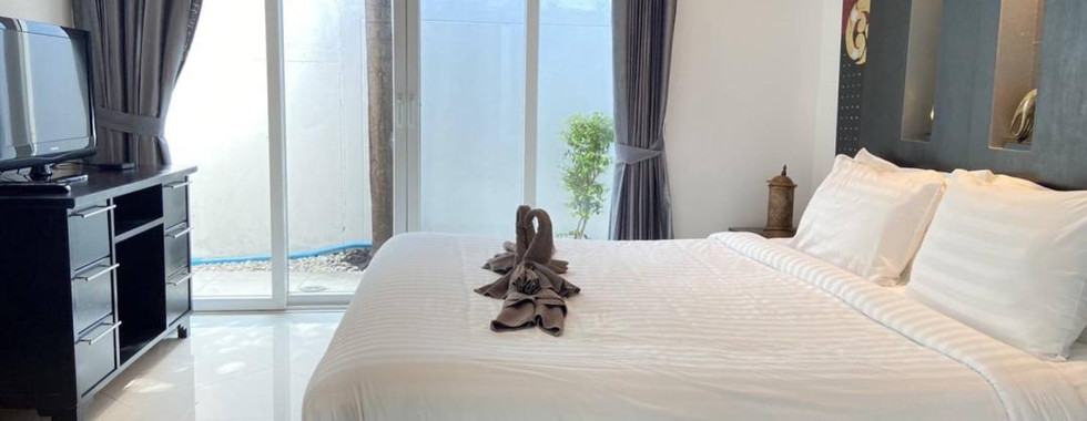 ห้องนอนที่ 1- เตียงขนาด 6 ฟุต 1 เตียงมีห้องน้ำในตัว